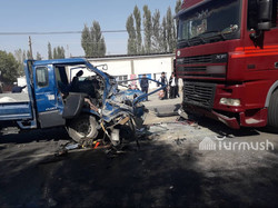 Сүрөт: Өзгөндө жүк ташыган унаа менен кагышкан «Мерседес-Бенц» талкаланып, 3 адам жабыркады