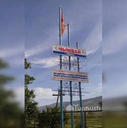 Чымбай айылынын кире беришинде тытылган желек илинип турат